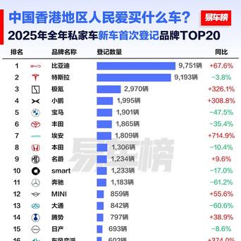 根据香港运输署公布的数据显示,在2025年香港私家车新车首次登记品牌TOP20当中,有8个品牌来自大陆企业,在TOP10当中,大陆品牌更是占了5个,分别是比亚迪,极氪,小鹏,埃安和名爵(目前属于上汽集团),其中比亚迪更是以9751辆登顶榜首,而且同比增长高达67.6%。