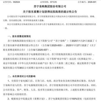 【首富跌落神坛:张近东的钱配资学习网,到底是怎么没的?】1月6日上市公司ST易购发布《关于股东重整计划获得法院批准的提示性公告》,披露公司收到股东苏宁电器集团有限公司、苏宁控股集团有限公司发来的《告知函》,前述股东收到江苏省南京市中级人民法院(以下简称“南京中院”)送达的《民事裁定书》,南京中院依据《中华人民共和国企业破产法》第八十六条第二款之规定,裁定批准苏宁电器集团有限公司等38家公司重整计划并终止实质合并重整程序。